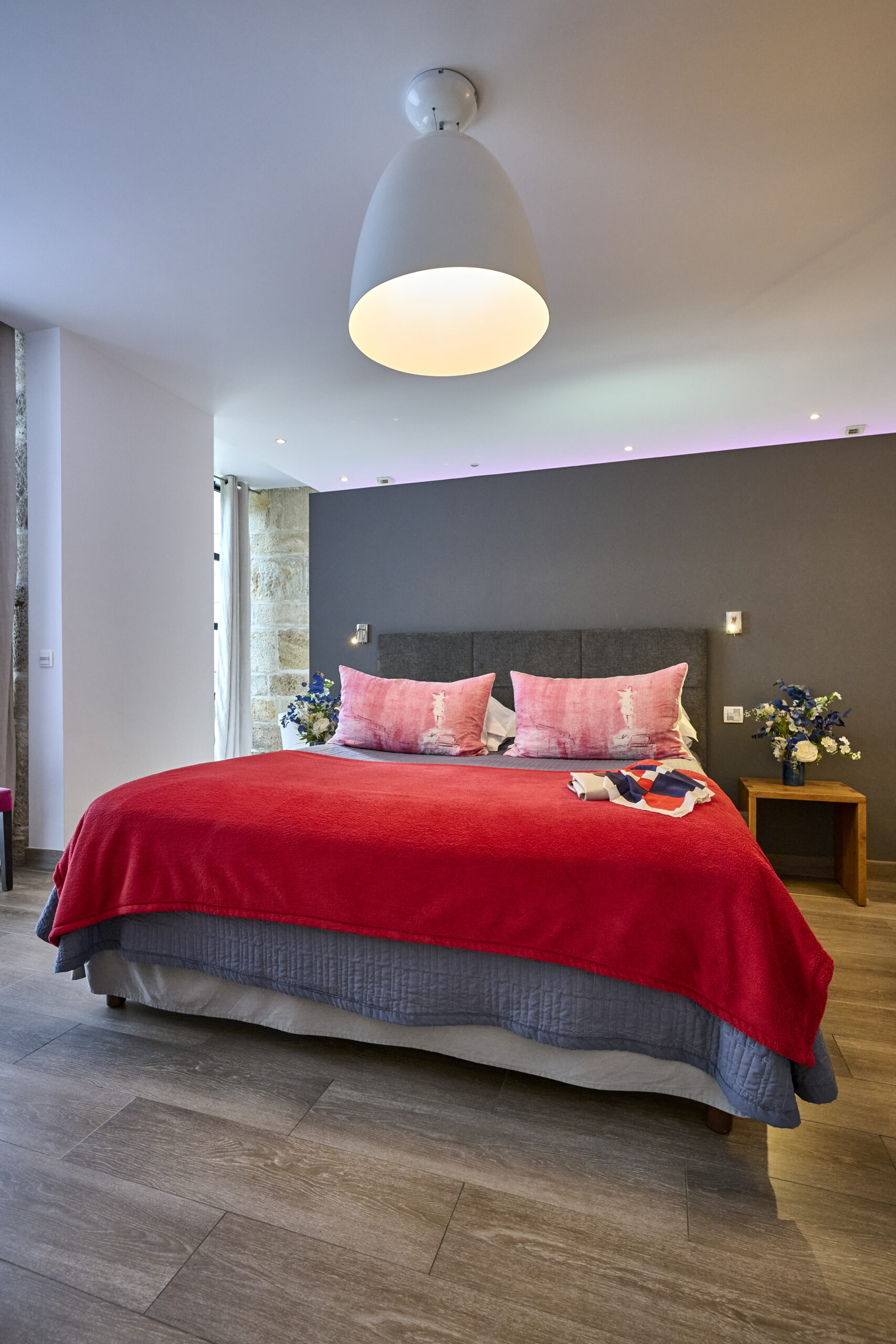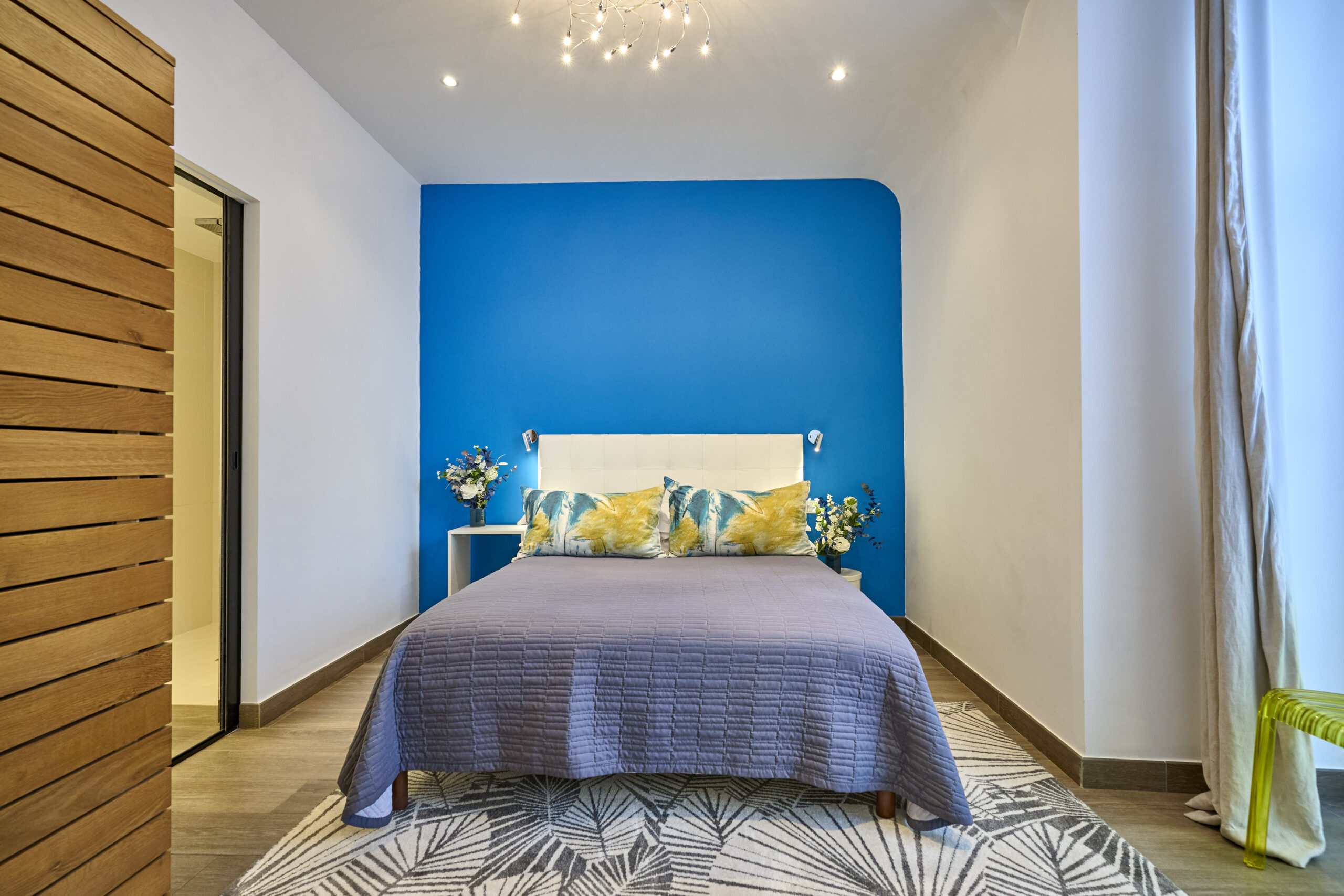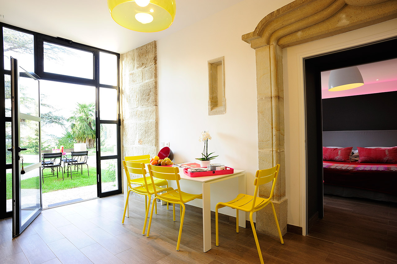 Immaculate white, bright yellow, fuchsia, noble materials, royal blue… a range of colours awaits you in the three rooms of this modern accommodation. The private garden terrace, opening onto the grounds, gives you a feeling of harmony with nature.