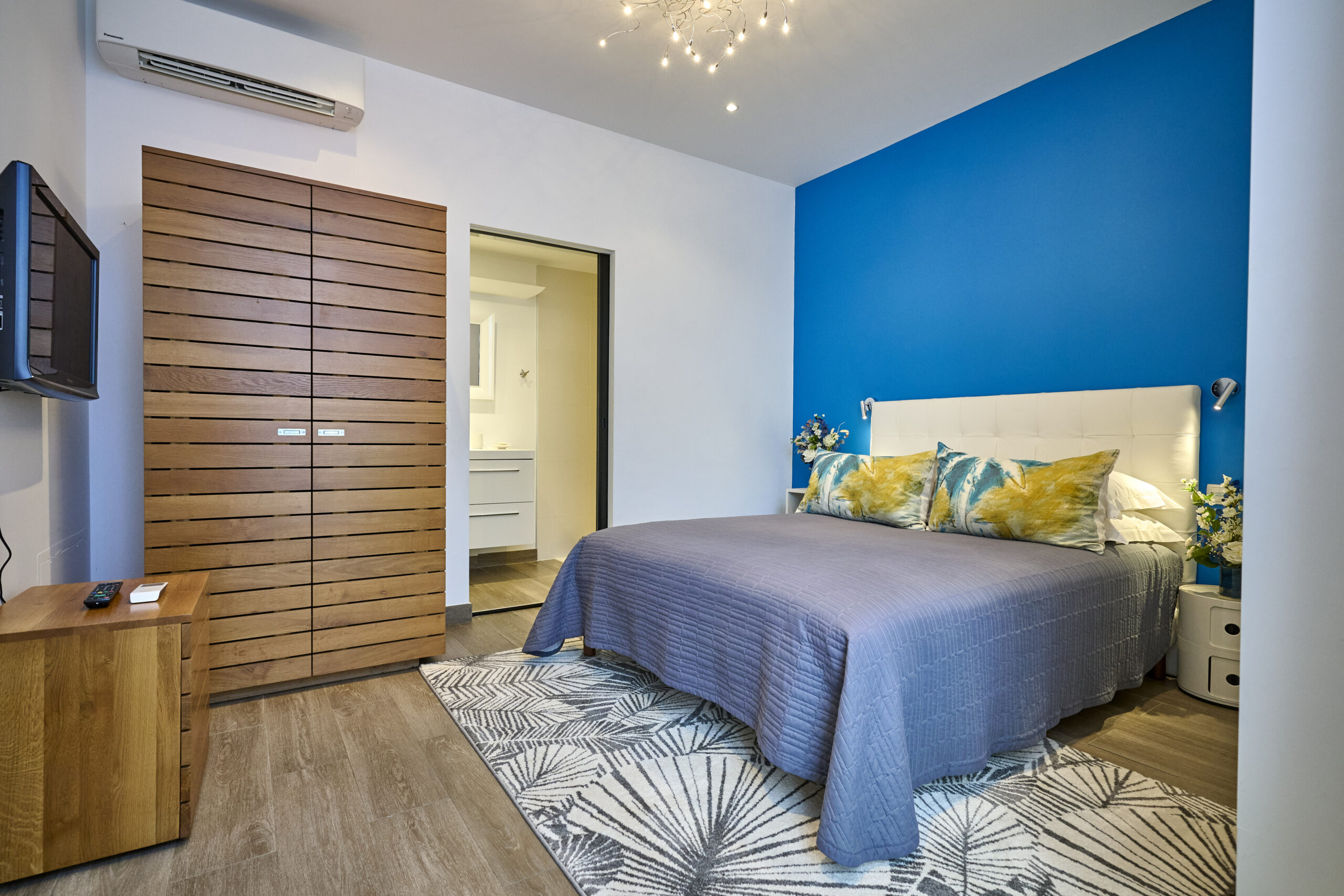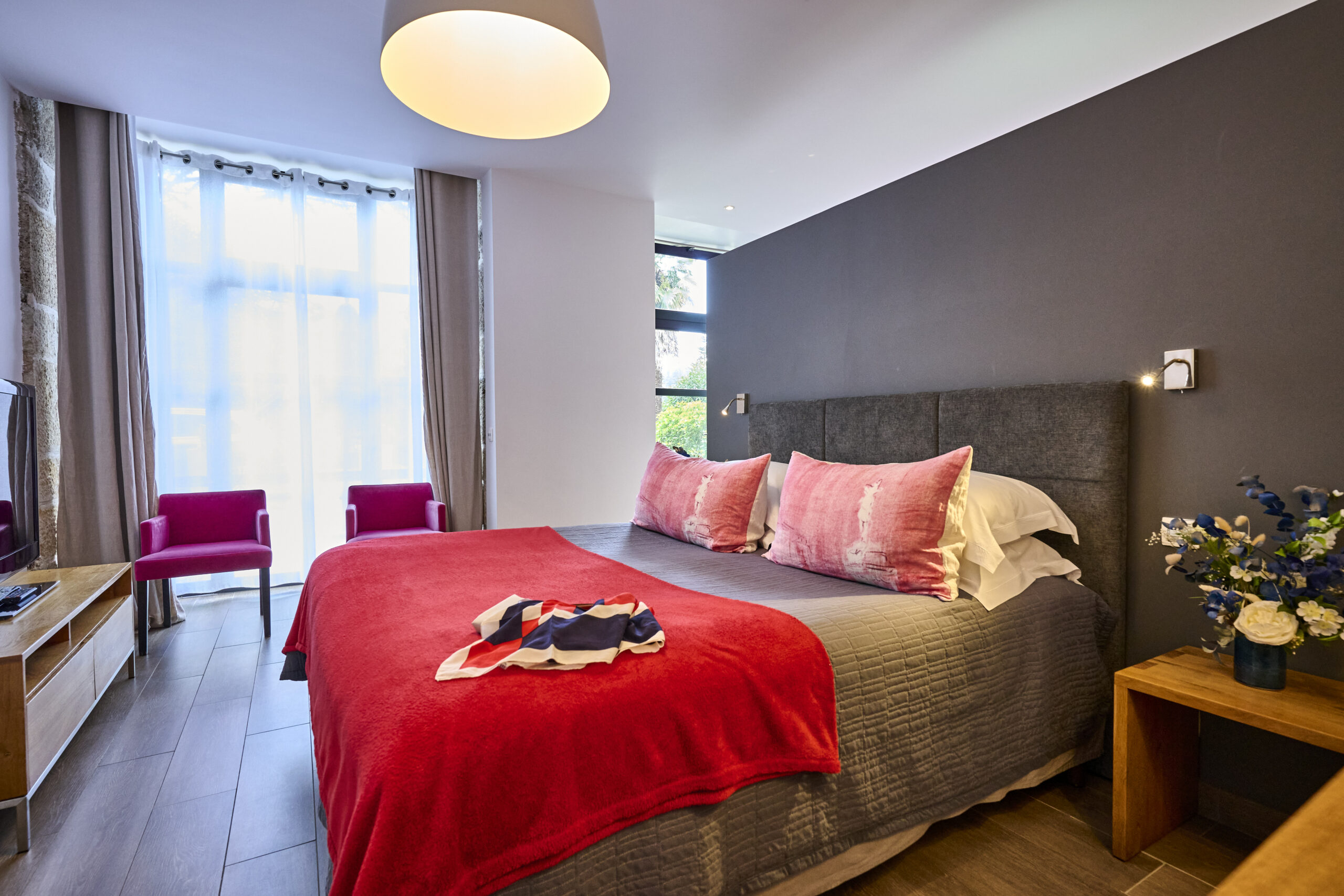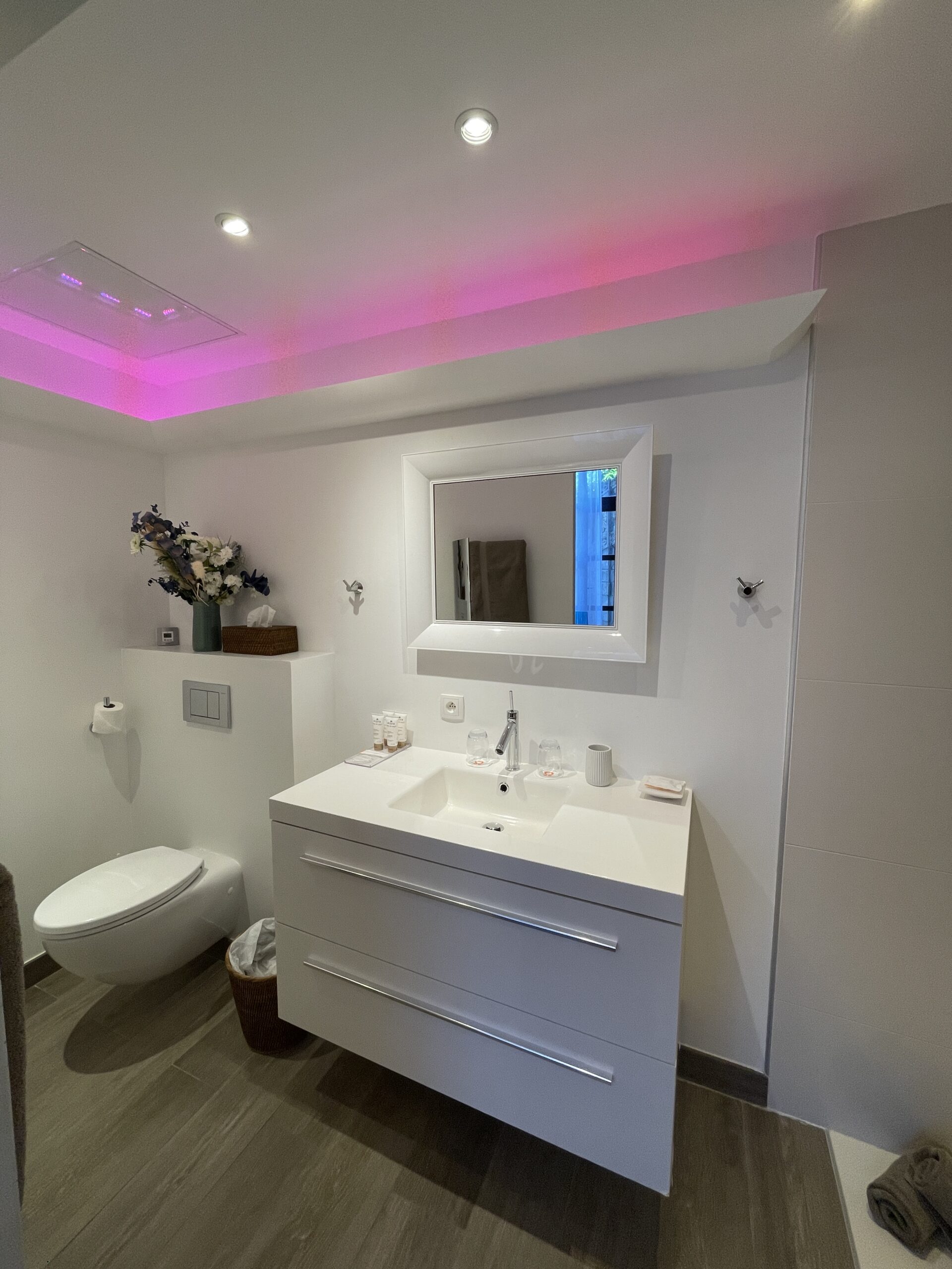 Immaculate white, bright yellow, fuchsia, noble materials, royal blue… a range of colours awaits you in the three rooms of this modern accommodation. The private garden terrace, opening onto the grounds, gives you a feeling of harmony with nature.