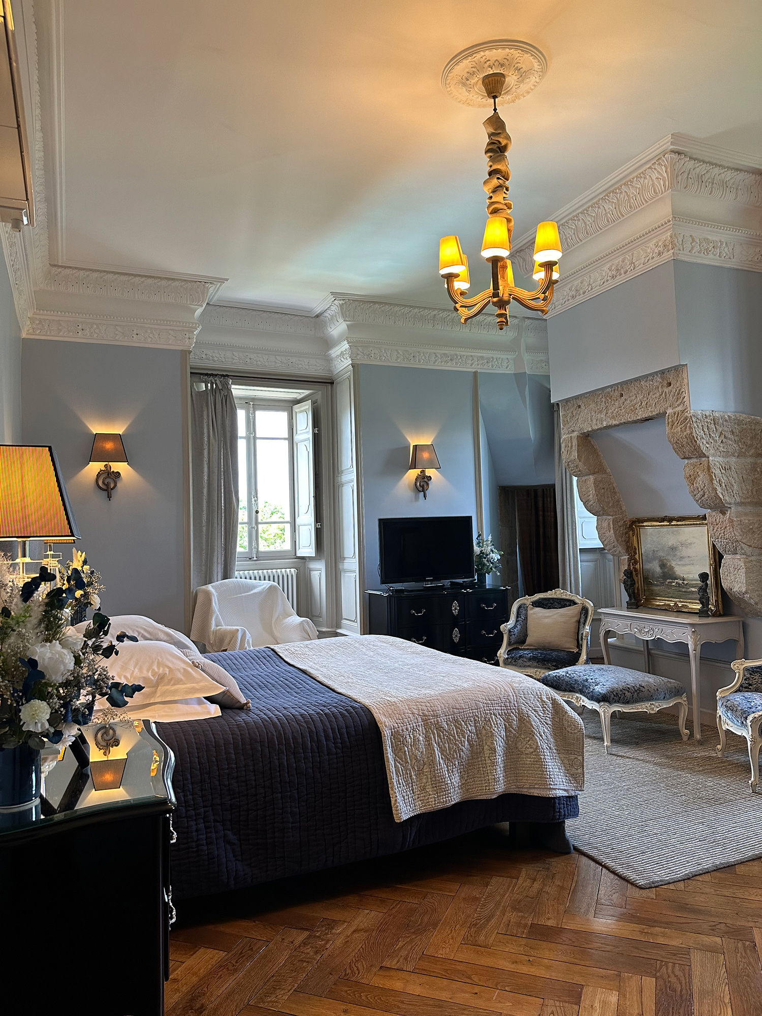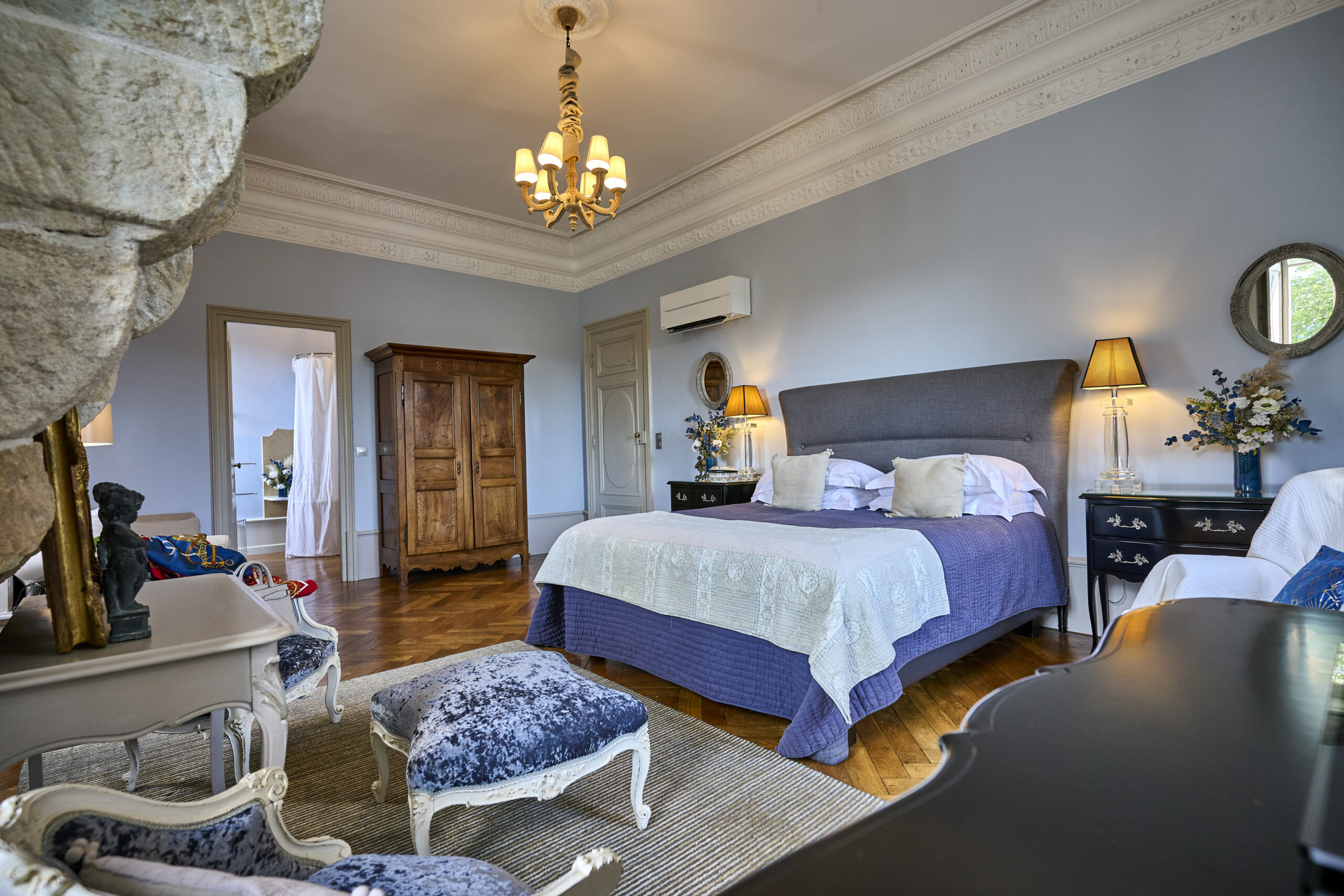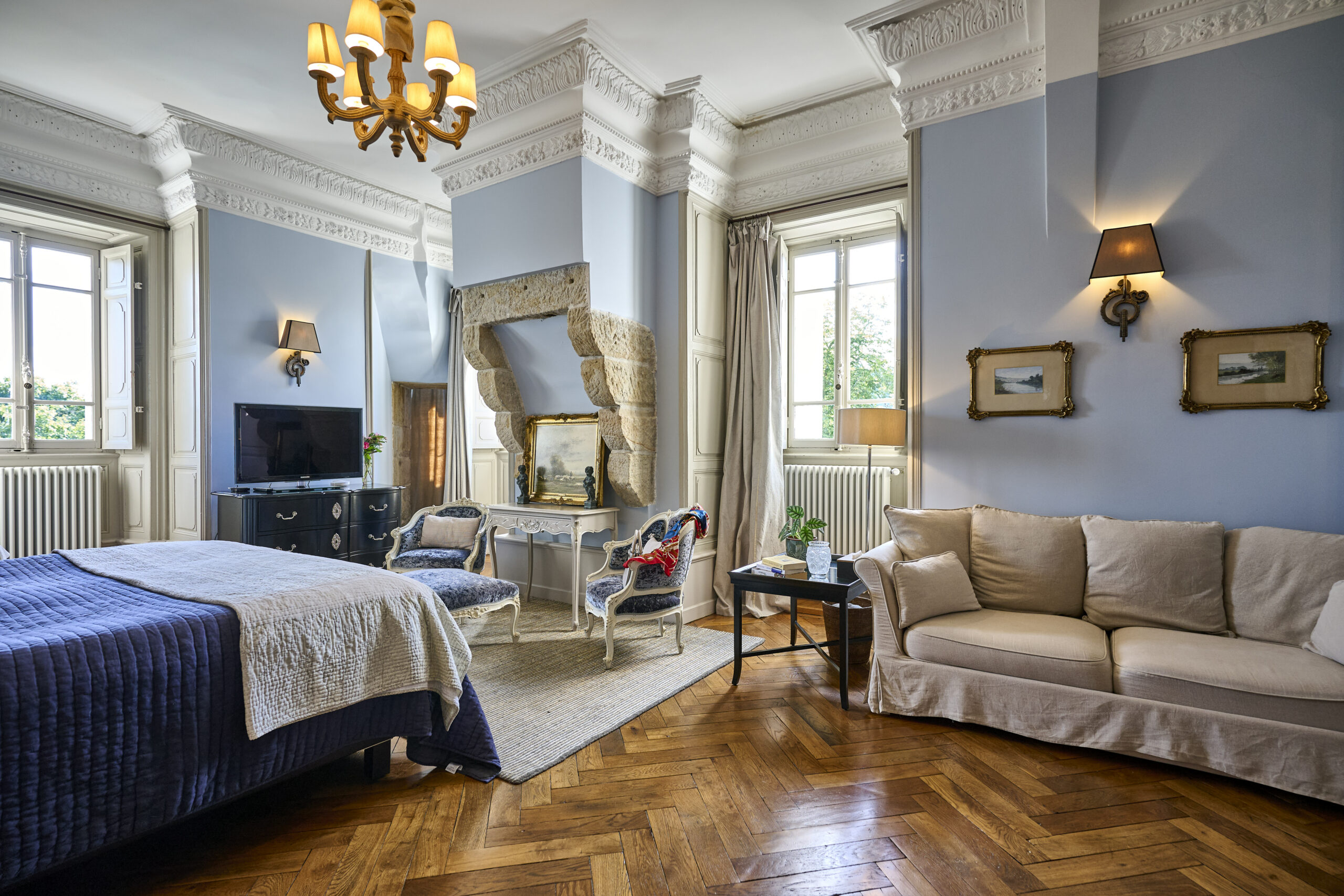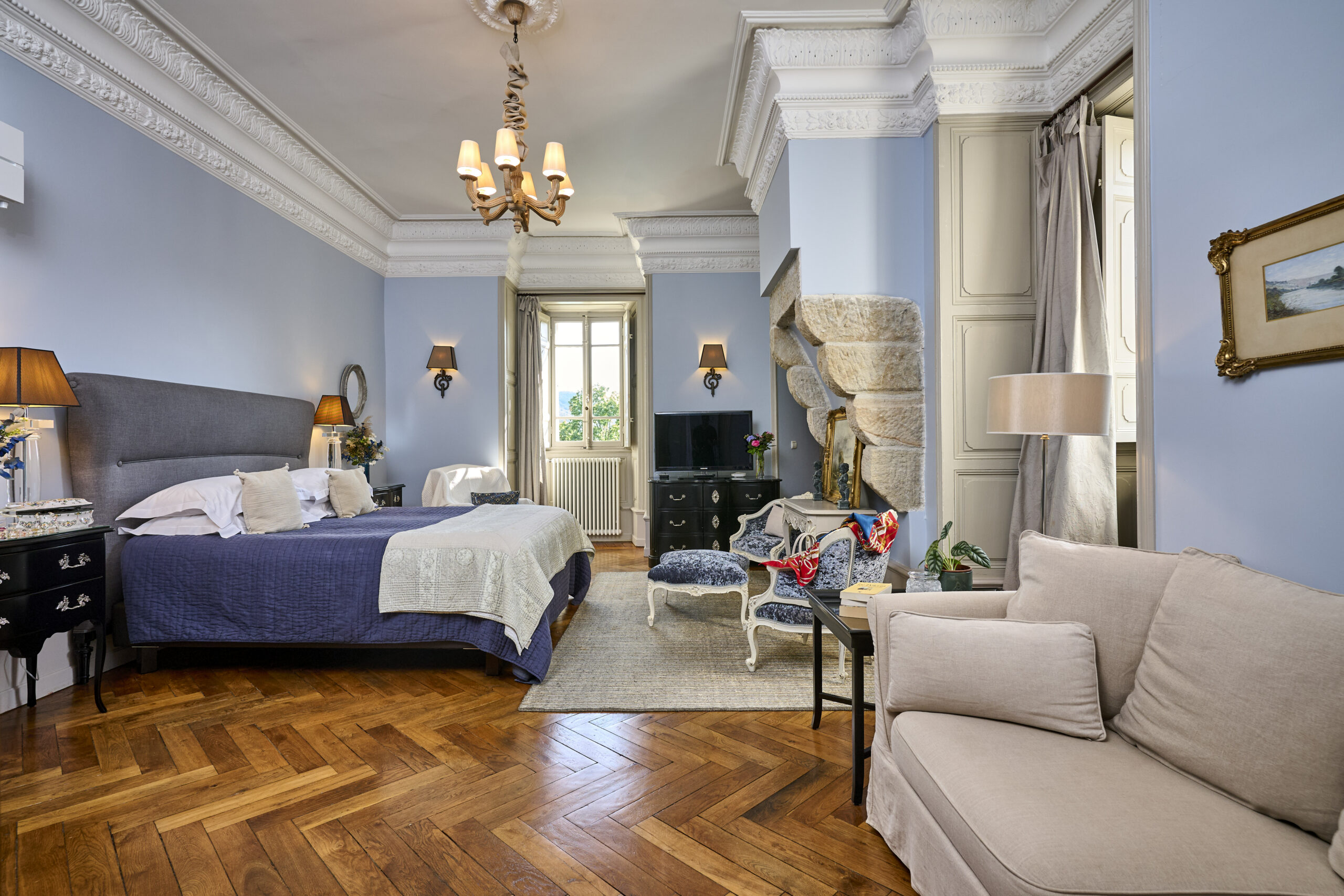 The blue walls blend lightly with beige and stone tones, creating a harmonious atmosphere in this beautiful and spacious room.