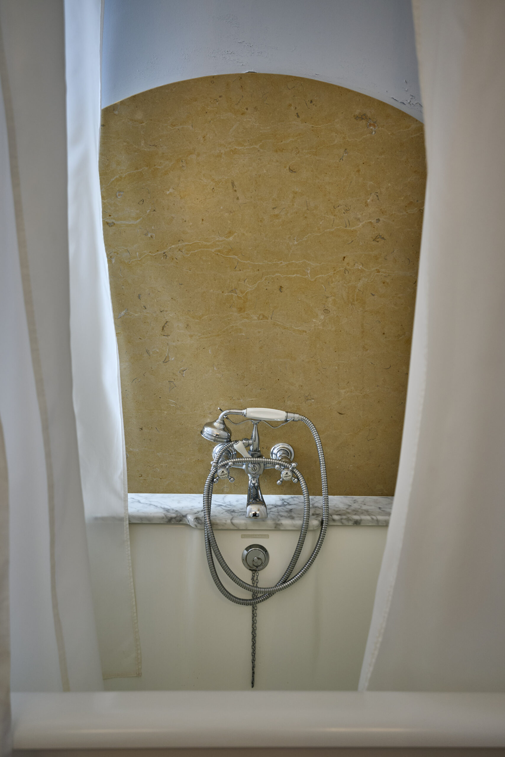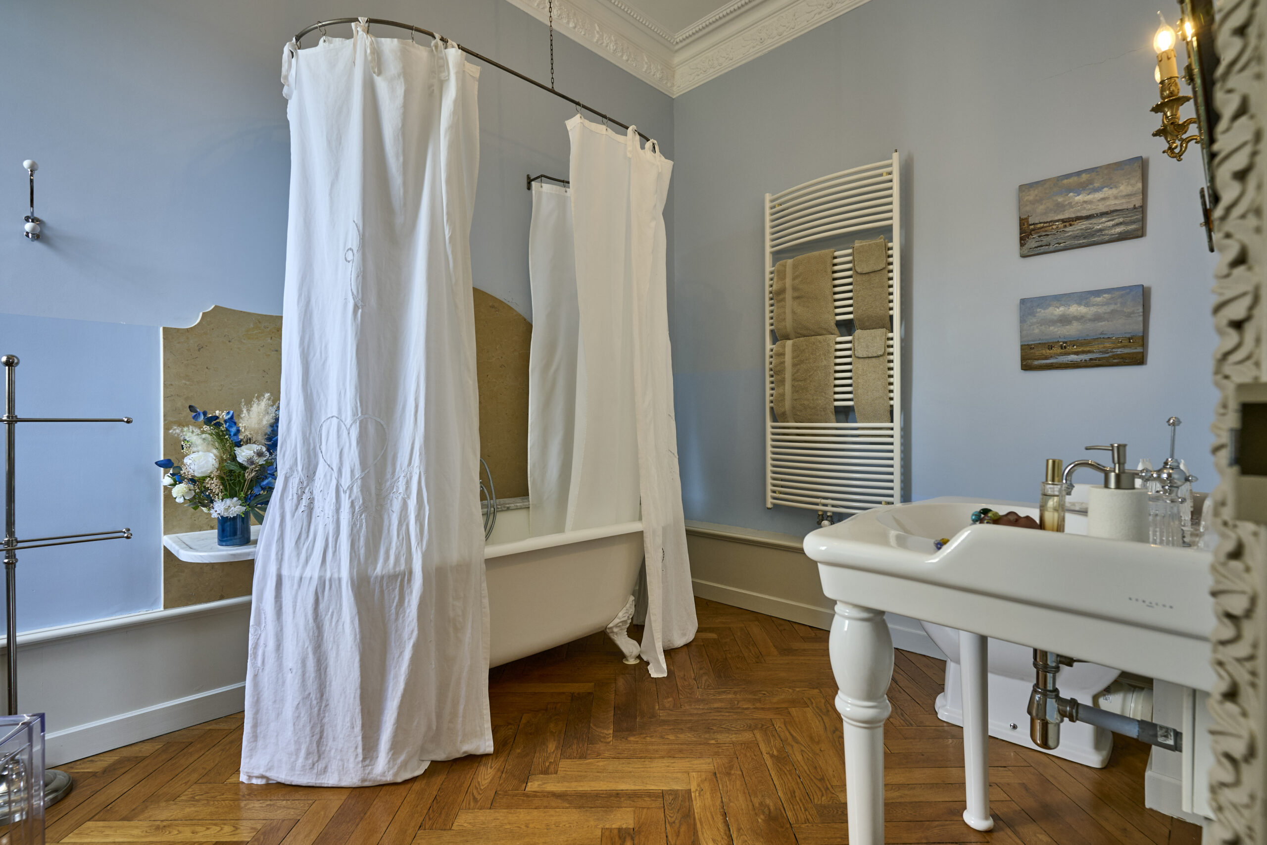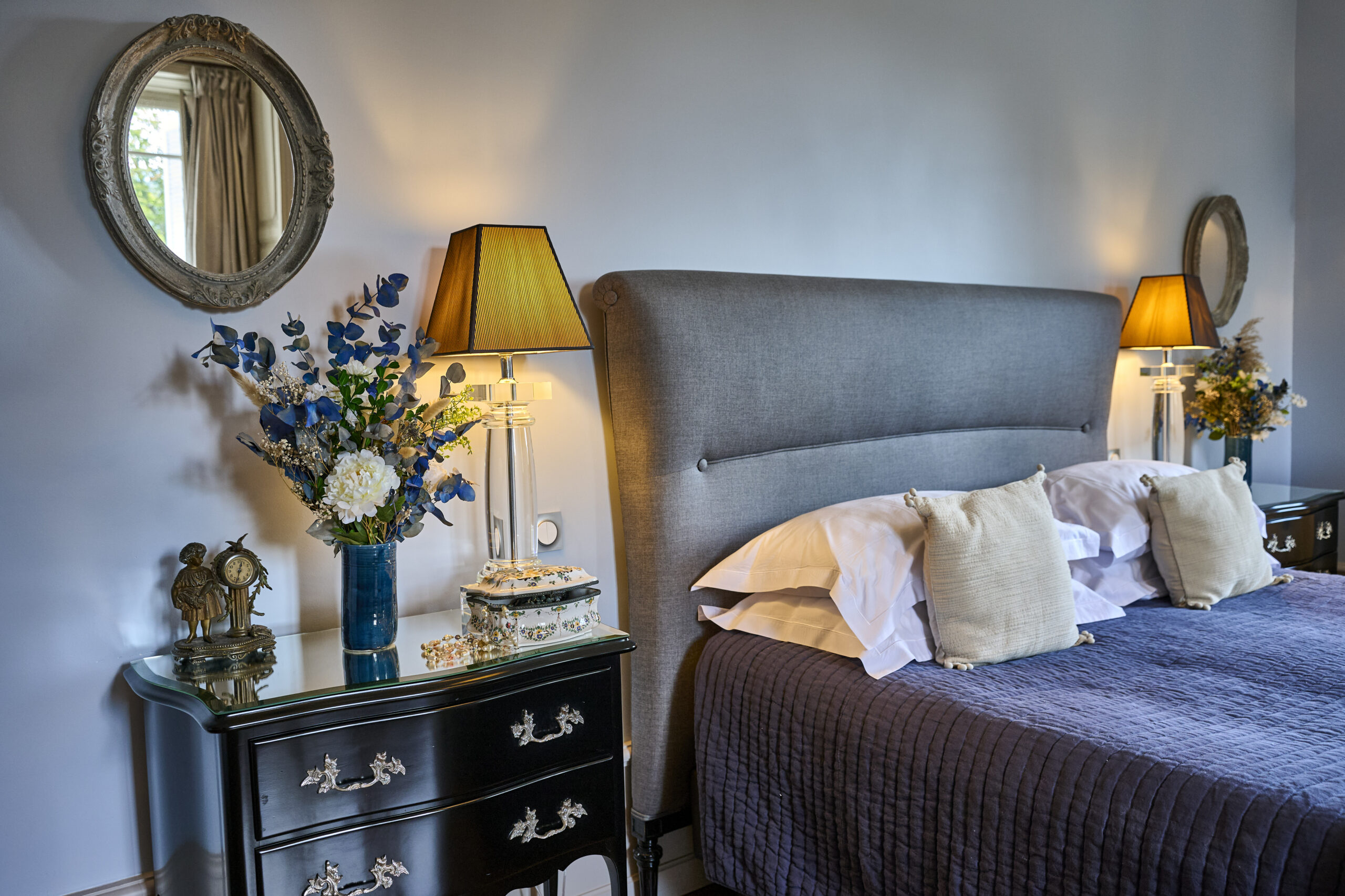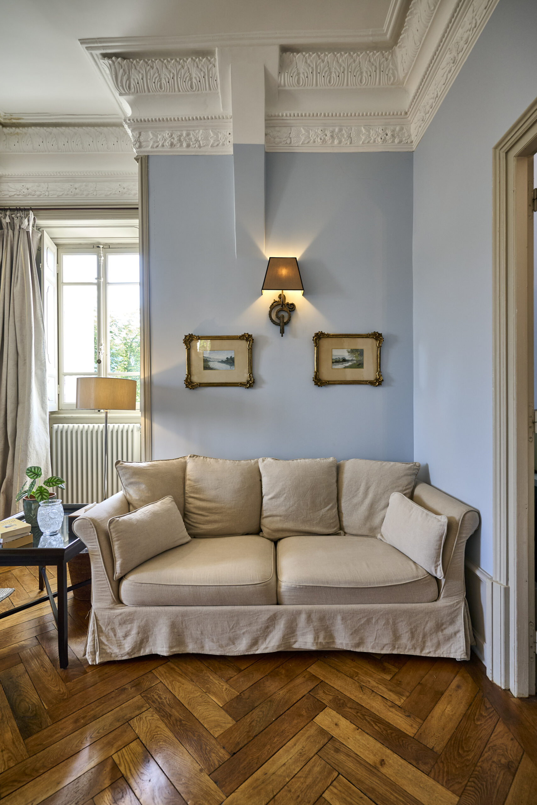 The blue walls blend lightly with beige and stone tones, creating a harmonious atmosphere in this beautiful and spacious room.